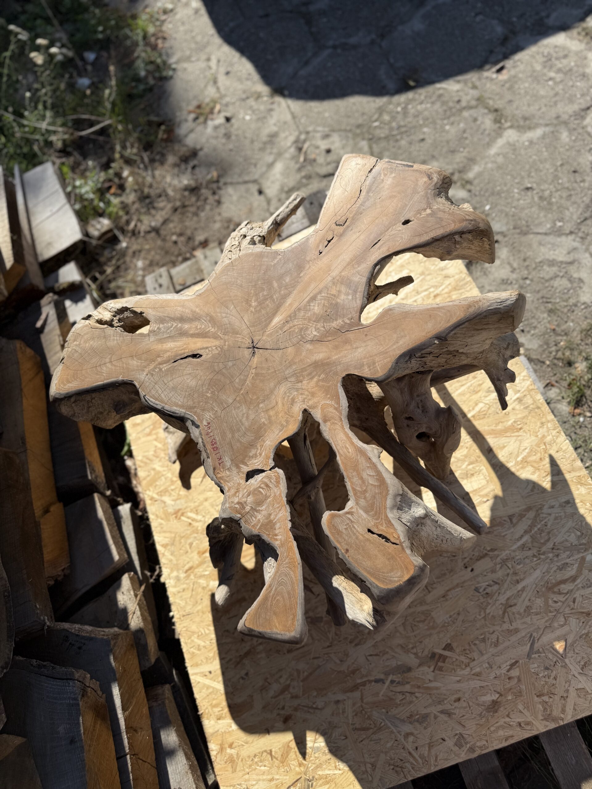 Niepowtarzalny korzeń z drewna tekowego o wymiarach 80 × 80 cm i wysokości 44 cm, starannie wysuszony i gotowy do dalszej pracy. Może pełnić funkcję stolika kawowego, podstawy pod szklany blat lub wyjątkowej dekoracji do wnętrz.